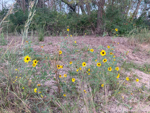 Sunflowers were blooming. Also? The storm damaged trees that haven't been cleaned up, have rotted away to where many of the paths are passable again.